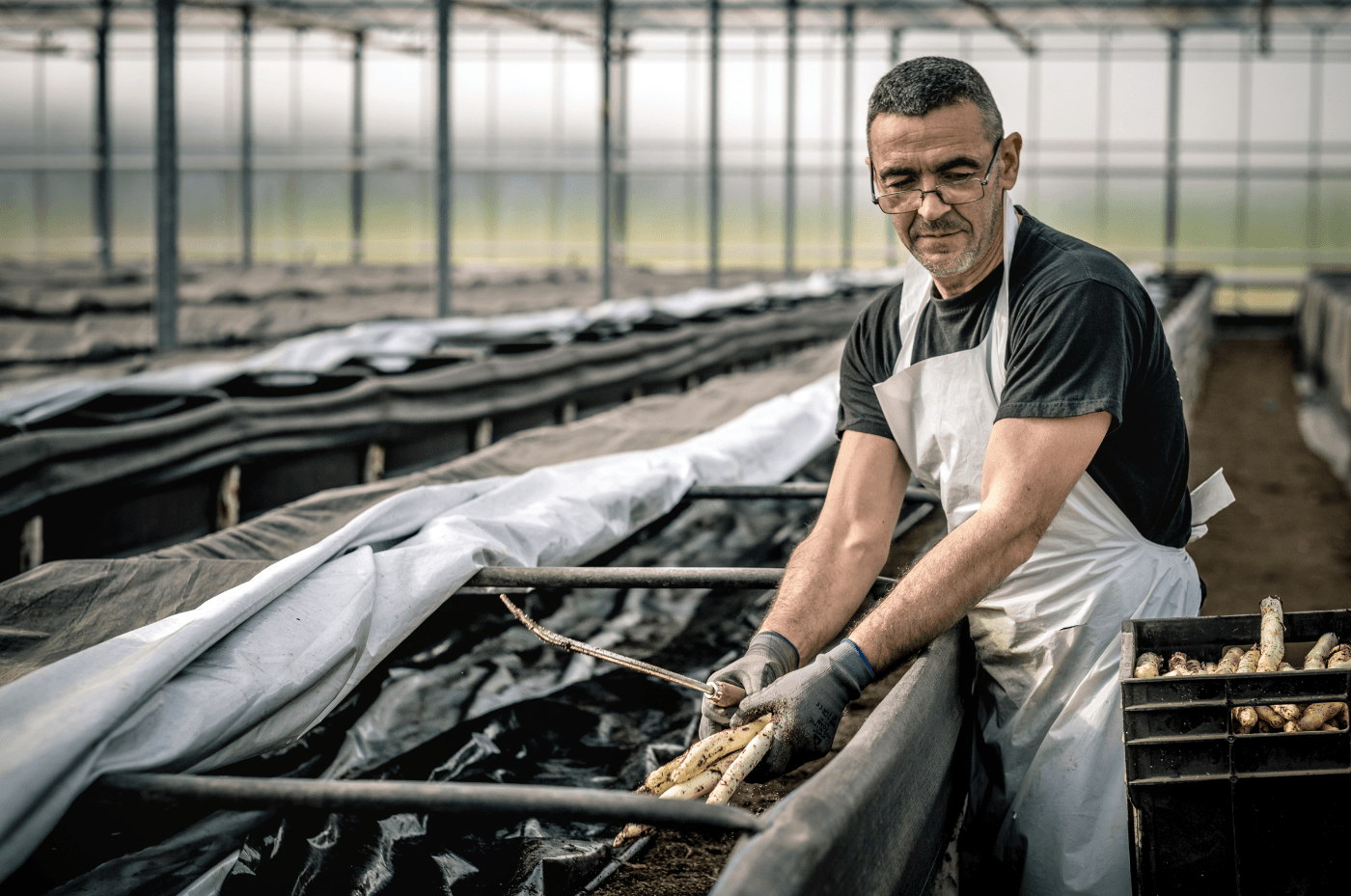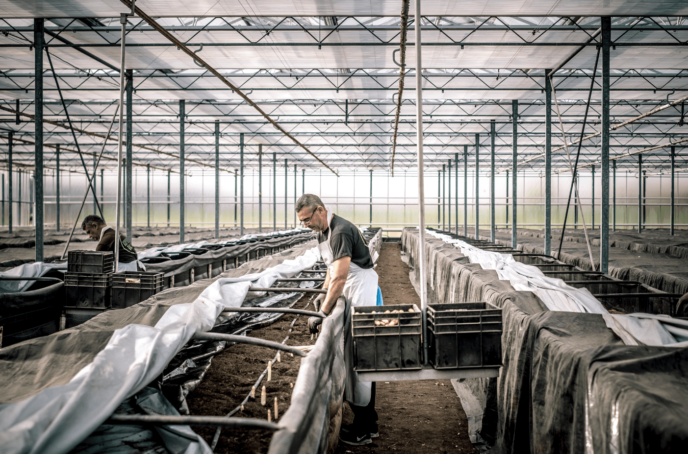Bij echt warm weer kunnen asperges tot 10 cm per dag groeien. Dan moet je ze ook direct kunnen ‘steken’ of uit de grond halen. Daarom controleert zijn team de serre van 11.000 m2 en de buitenplantage van 3,5 ha quasi elke dag. “Buiten moeten we elke dag alle rijen controleren. Ook al staat er hier en daar maar een asperge, die moet er wel uit. In de periode dat er in de serre geoogst wordt, is dat anders. Daar trachten we op drie dagen twee keer rond te gaan.”