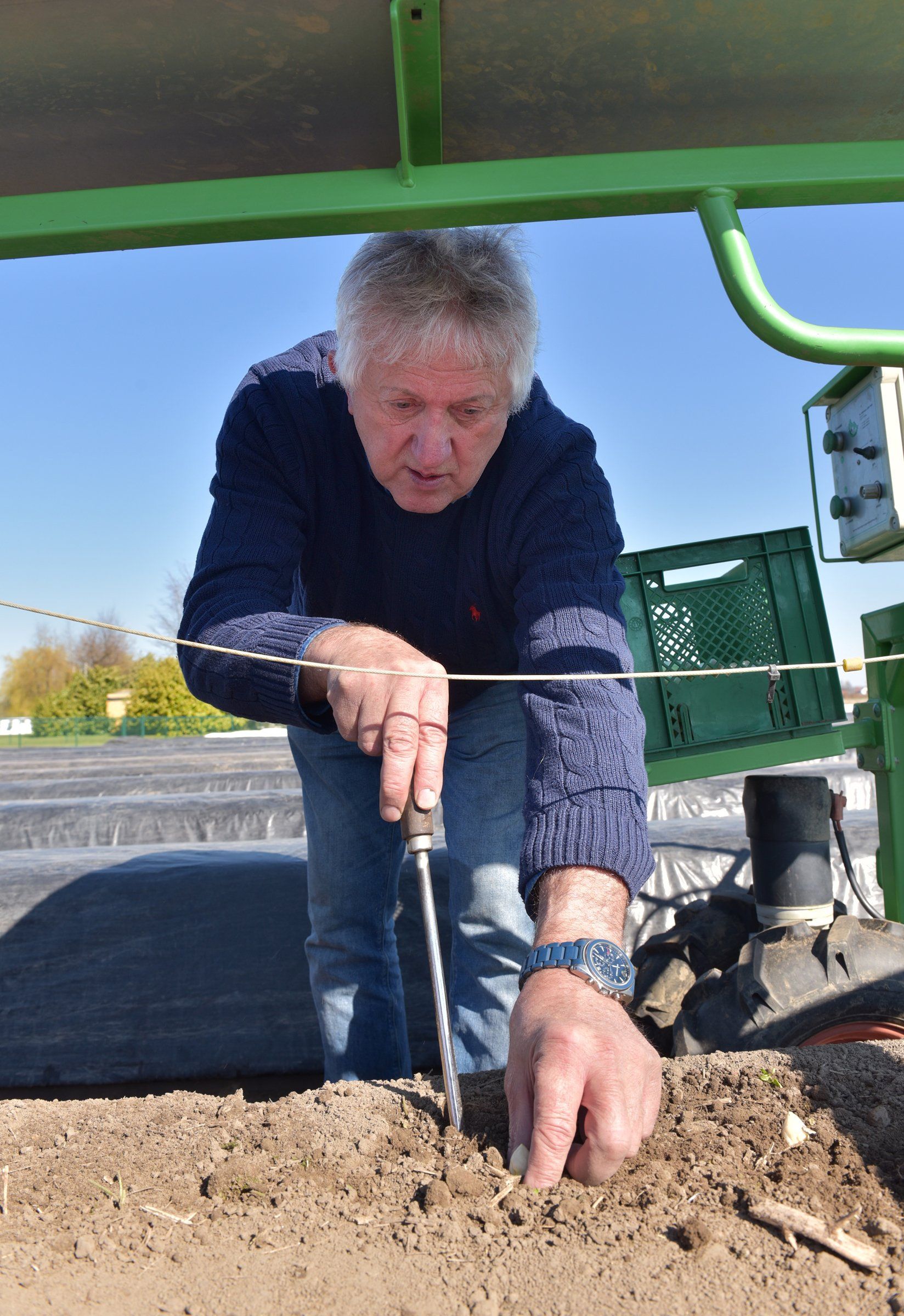 Hoe het moet? Jos: "Je doet wat aarde rond het kopje weg zodat je het voorzichtig kunt vastnemen en maakt er dan een klein putje naast met je mes. Je laat het mes erin glijden tot je niet meer verder kunt, je zit dan op de klauw, en met een korte krachtige stoot richting asperge snij je deze af. De putjes vul je en de asperge gaat in een bak op de machine. Aan het begin van het seizoen steken we om de twee dagen, daarna elke dag. We beginnen om 6 uur en na twee uur is er een hectare gestoken."